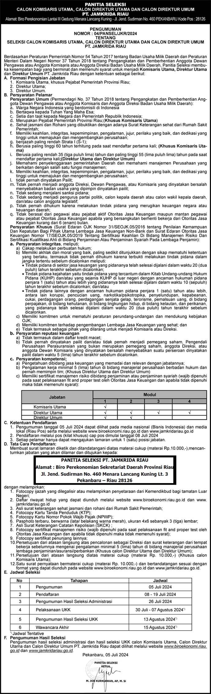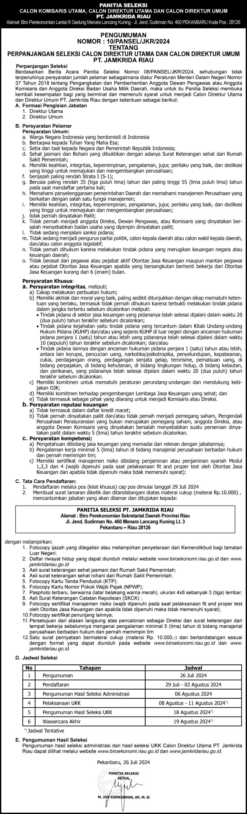 PERPANJANGAN PENGUMUMAN SELEKSI CALON DIREKTUR UTAMA DAN DIREKTUR UMUM PT. JAMKRIDA RIAU