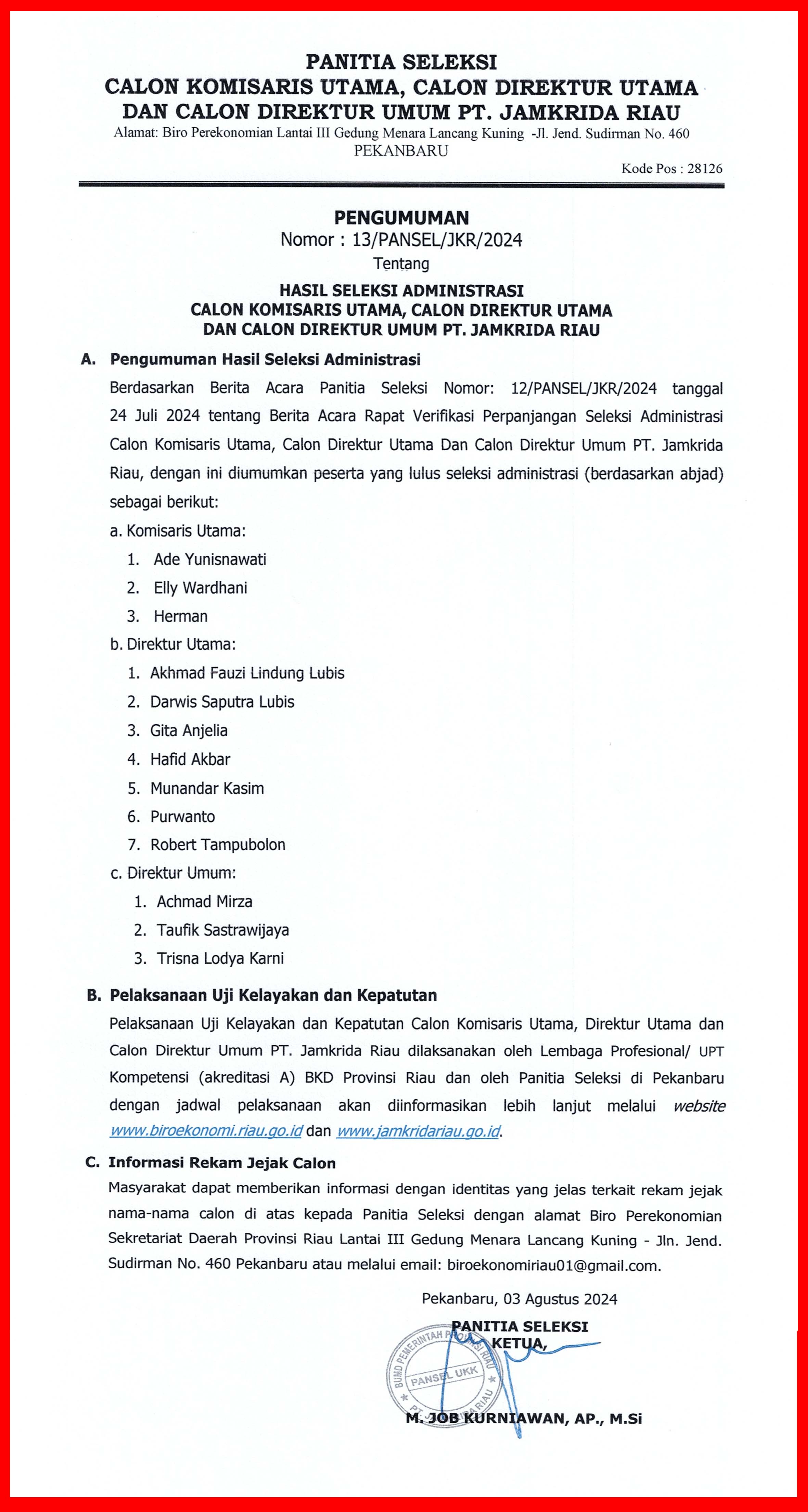 Pengumuman Hasil Seleksi Administrasi Calon Komisaris Utama, Calon Direktur Utama dan Calon Direktur Umum PT. Jamkrida Riau