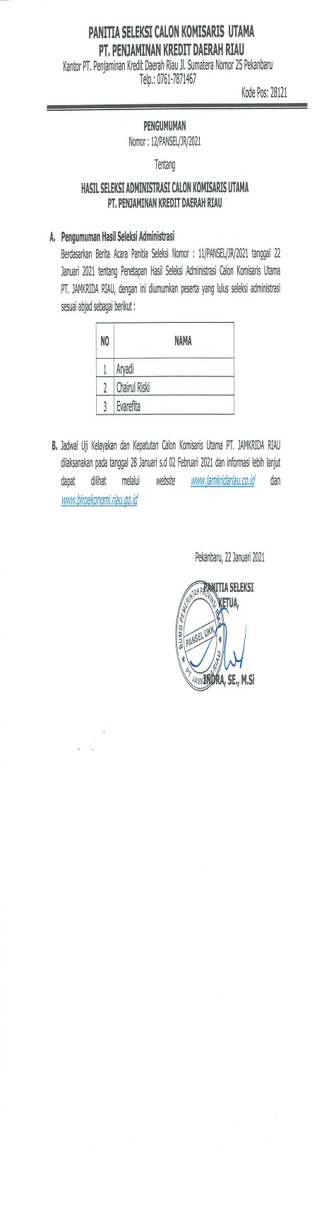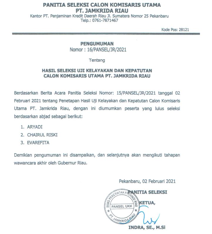 Pengumuman Hasil UKK Komisaris Utama PT. Jamkrida