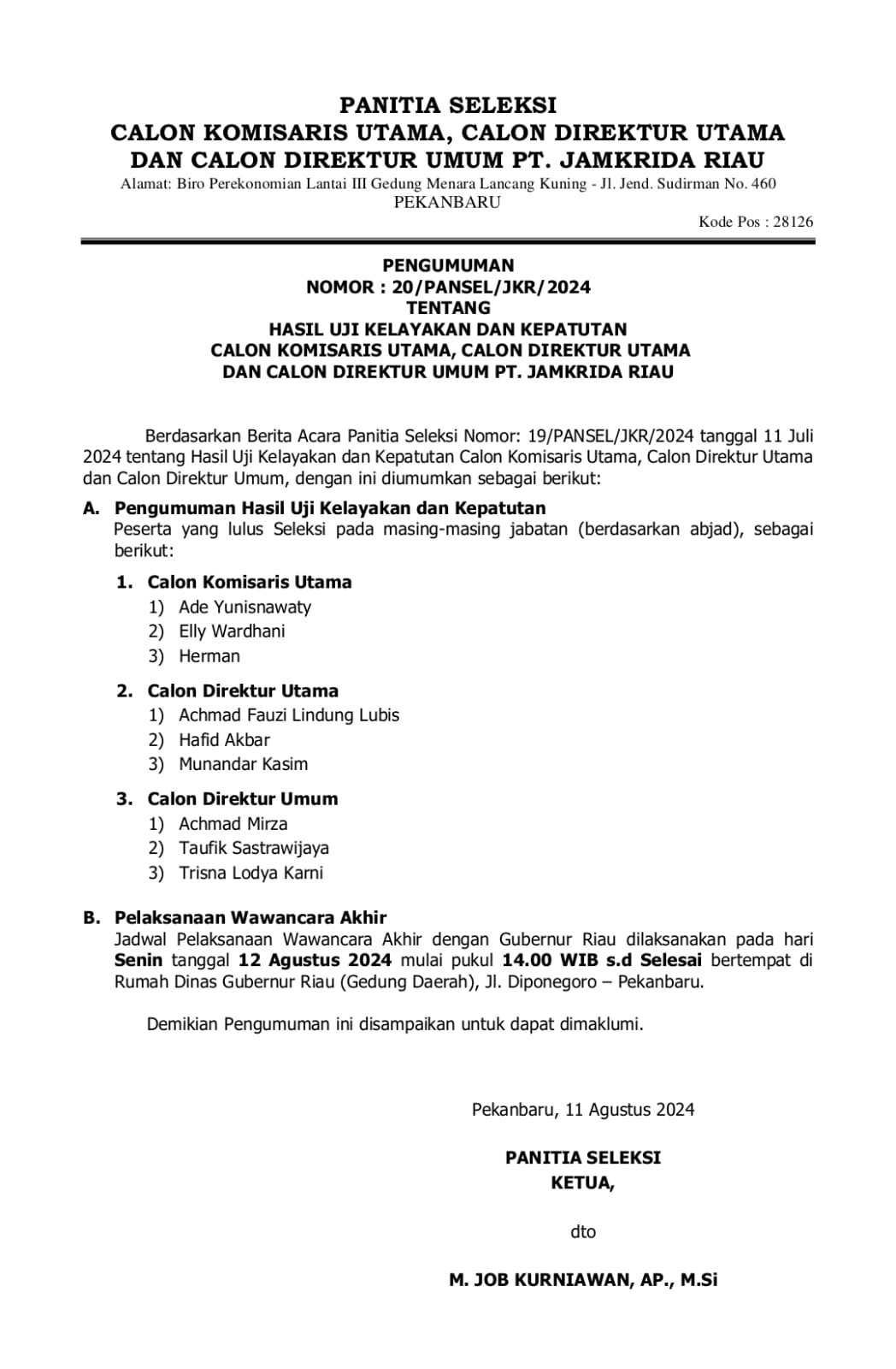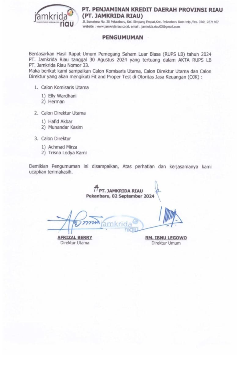 Pengumuman Calon Komisaris Utama, Calon Direktur Utama dan Calon Direktur yang akan mengikuti Fit and Proper Test di Otoritas Jasa Keuangan (OJK), berdasarkan Hasil Rapat Umum Pemegang Saham Luar Biasa (RUPS LB) tahun 2024 PT. Jamkrida Riau tanggal 30 Agustus 2024 yang tertuang dalam AKTA RUPS LB PT ...Selengkapnya