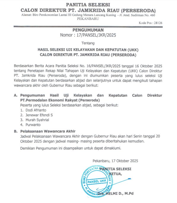 Pengumuman Seleksi Calon Direktur PT. Jamkrida Riau (Perseroda)